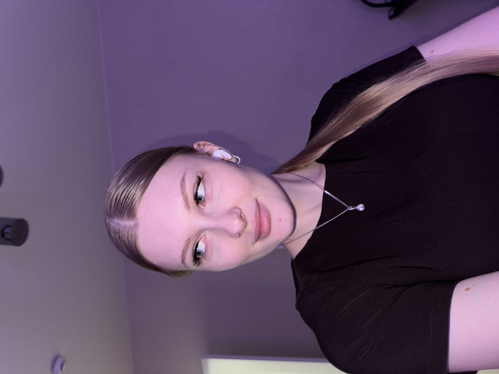 A young fair-skinned woman with blonde hair pulled back is depicted indoors. She is wearing a black top and a silver necklace. Her gaze is directed towards the viewer. An earbud is visible in her ear. The background appears to be a purplish hue, suggesting specific lighting within the room. The location of Perm, Russia, cannot be determined from the image provided.