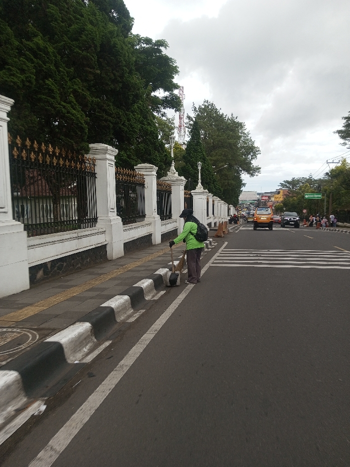 The scene depicts an urban streetscape under an overcast sky during daylight hours, identified as located in the city of Sandamal Eliya, Sri Lanka. In the foreground, a sidewalk with grey paving stones and a yellow tactile paving strip runs parallel to an asphalt road. A black and white painted concrete curb/median separates the sidewalk from the roadway. A lone individual, dressed in a lime green long-sleeved shirt, dark trousers, and a dark cap, is positioned in the gutter area next to the curb. The person wears a dark backpack and is actively using a broom and a dark scoop/dustpan to clear debris from the roadside. The asphalt road features a continuous white line marking the edge of a lane, and a white zebra crossing is partially visible to the immediate right of the individual. In the midground, an ornate perimeter fence stretches along the left side, characterized by white concrete pillars with black and gold decorative metalwork sections. Behind this fence, dense green trees partially obscure a building with a visible reddish roofline. On the road, several vehicles are present, including a distinct yellow SUV-type vehicle followed by a dark sedan, with additional traffic receding into the distance. A green street sign, displaying unreadable text, is situated on the right side of the road, above a group of indistinct figures gathered on what appears to be a distant sidewalk or shoulder. The background is dominated by a dense canopy of lush green foliage from numerous large trees. A prominent red and white lattice telecommunications tower rises above the trees on the left side of the frame. The sky is uniformly grey and overcast.