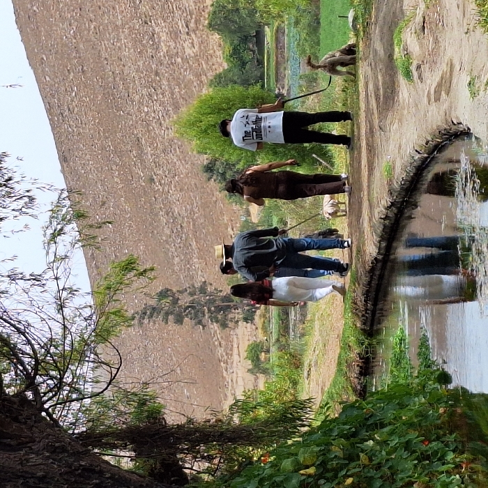 The scene depicts an outdoor environment in Characato, Peru, with a narrow irrigation canal or stream flowing along a dirt path. To the immediate left, the branches and foliage of a large tree overhang the canal. Four individuals and two dogs are present on the dirt path, walking generally from left to right. From left to right on the path: 1. A female, with long dark hair, wearing a red and white plaid shirt and white pants. 2. A male, wearing a dark blue collared shirt, blue jeans, and a straw hat. He holds a leash connected to a light-colored, fluffy dog walking beside him. 3. A female, with long dark hair, wearing a brown tank top and dark pants, walking slightly behind the male in the straw hat. 4. A male, wearing a white t-shirt with "The Godfather" text on the back and dark pants. He holds a dark stick or leash. To the far right of the path, a second dog, smaller and darker-ffurred, is observed in a squatting position, appearing to defecate. The canal in the foreground contains still water, reflecting the sky and adjacent vegetation. Beyond the path, in the midground, lie green cultivated fields and scattered trees. The background is dominated by a large, dry, light-brown hill with a rocky or sandy texture. The sky overhead is clear and bright.