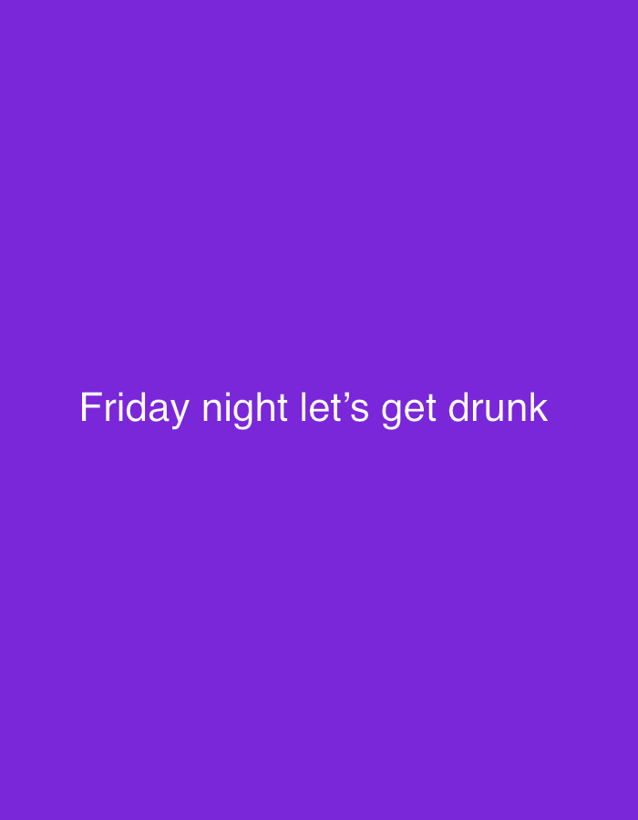 The image displays a solid purple background with white text centered horizontally. The text reads: "Friday night let's get drunk". There are no discernible people, subjects, objects, actions, interactions, or environmental details present. The image does not provide any information regarding a location in Paris, France, or any other city.