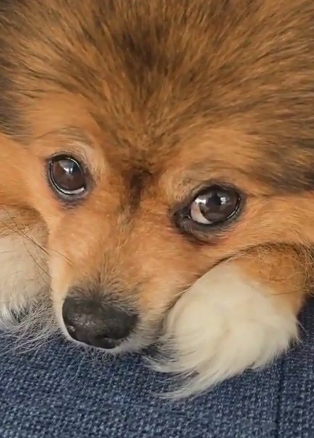 A close-up video features a long-haired dog, possibly a Pomeranian, lying down on a blue fabric surface. The dog's fur is primarily brown and tan with dark tips. It has white markings on its paws, which are resting under its chin. The dog gazes directly at the camera with large, expressive eyes. The background is minimalistic, showing the sofa and hints of a pink object in the upper left corner.