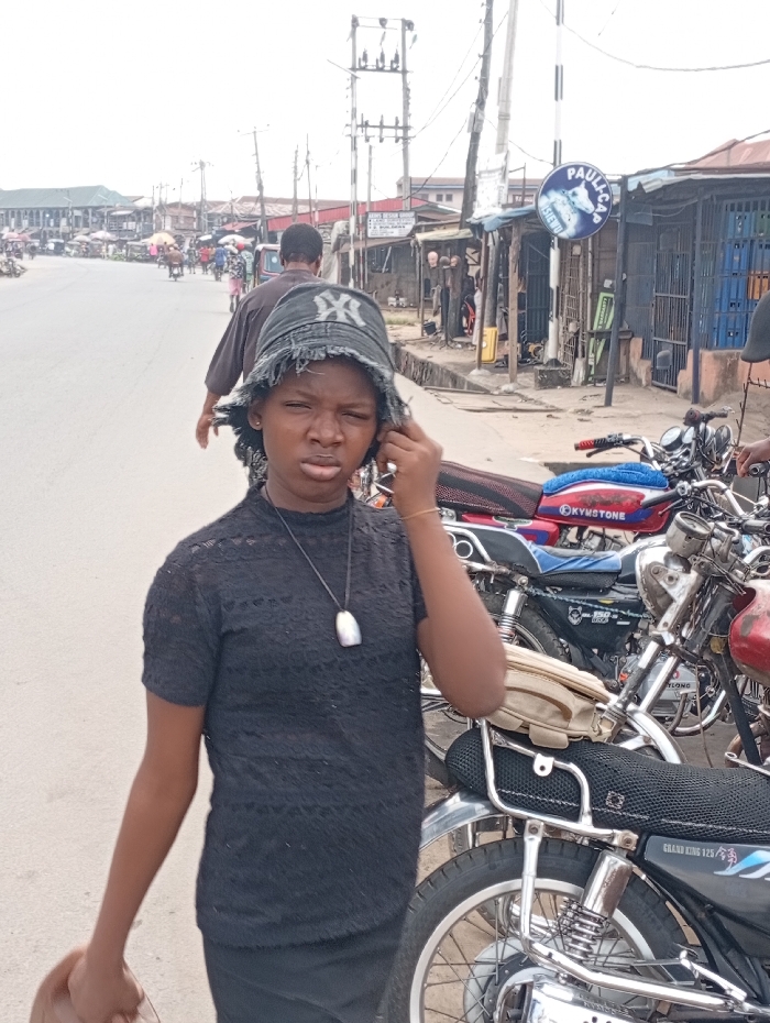 The image depicts a bustling street scene in Ura Nta Umuarandu, Nigeria, under an overcast sky. In the foreground, a young individual, appearing female, stands on a paved surface, looking directly at the camera with a slight pout. She wears a black, short-sleeved, textured top, a dark skirt, and a distressed black bucket hat with a white "NY" logo. A silver-colored pendant hangs from a dark chain around her neck. Her right hand is positioned near the brim of her hat, while her left hand holds an object, partially out of frame, that appears to be a light-colored bag. Immediately behind and to the right of the foreground subject, several motorcycles are parked, including one displaying "KYNGSTONE" and "GRAND KING 125" text, with a beige bag resting on its rear seat. Further back on the right, a series of market stalls or small shops with corrugated metal roofs line the street. A circular sign with "PAULLACA" is visible on one of these structures. Utility poles with numerous overhead wires are present throughout the midground. In the central midground, a person wearing a brown shirt and a dark cap walks away from the camera, partially obscured by the foreground individual. The background reveals a wide paved road extending into the distance, flanked by buildings of varying sizes, some multi-storied. Additional pedestrians and market activity are visible further down the street, indicating a commercial area.