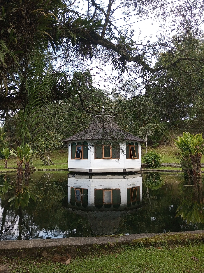 The image presents a forensic view of an octagonal white pavilion situated over a calm pond in Cimacan, Indonesia