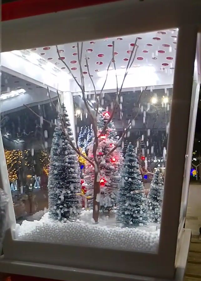 Christmas display inside of a white box with a clear front. The display features fake snow, small evergreen trees lit with various colored lights, a figure of Santa Claus, and a bare tree branch. Simulated snow falls within the box. The backdrop of the inside of the box is white with red polka dots. The overall scene evokes a Christmas or winter theme.