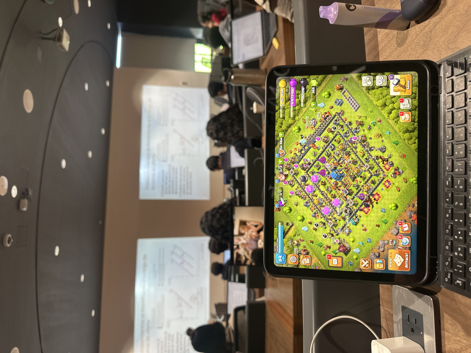 classroom setting with students attending a lecture. Two projection screens display presentation slides. In the foreground, a tablet displays the game Clash of Clans, placed next to a keyboard and vape pen. An outlet with a charger sits nearby. This suggests a student is playing during the lecture.