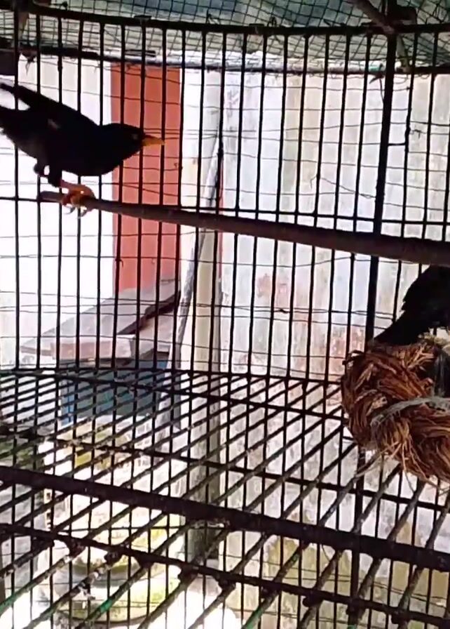 Two black birds with yellow beaks are in a wire cage. There is a nest made of hay in the lower right corner of the cage. One bird hops onto the perch near the top of the cage, flapping its wings in the process. The other bird stands on the bottom of the cage near the left side. The cage is in front of a white wall with black and white patterned fabric hanging to the left. A red door is visible behind the cage.