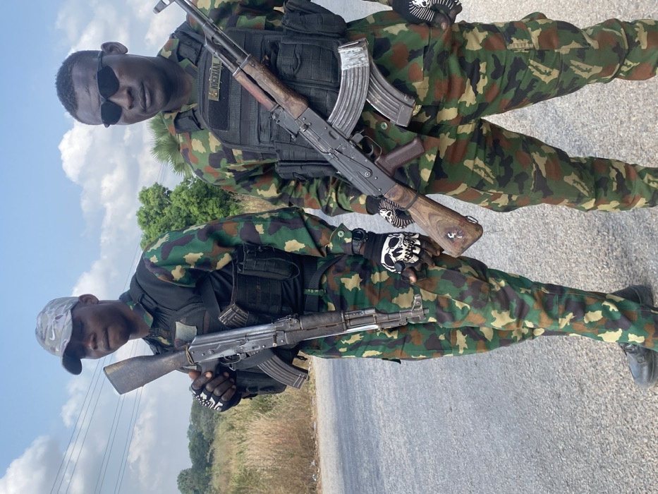 Two dark-skinned males, dressed in military-style green, brown, and tan camouflage uniforms, stand on a paved road under a partly cloudy blue sky in Zaki Biyem, Nigeria