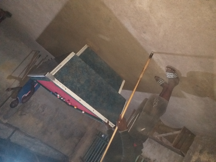 An indoor scene in Masaka, Nigeria, depicts two males playing or observing a game of pool under artificial lighting