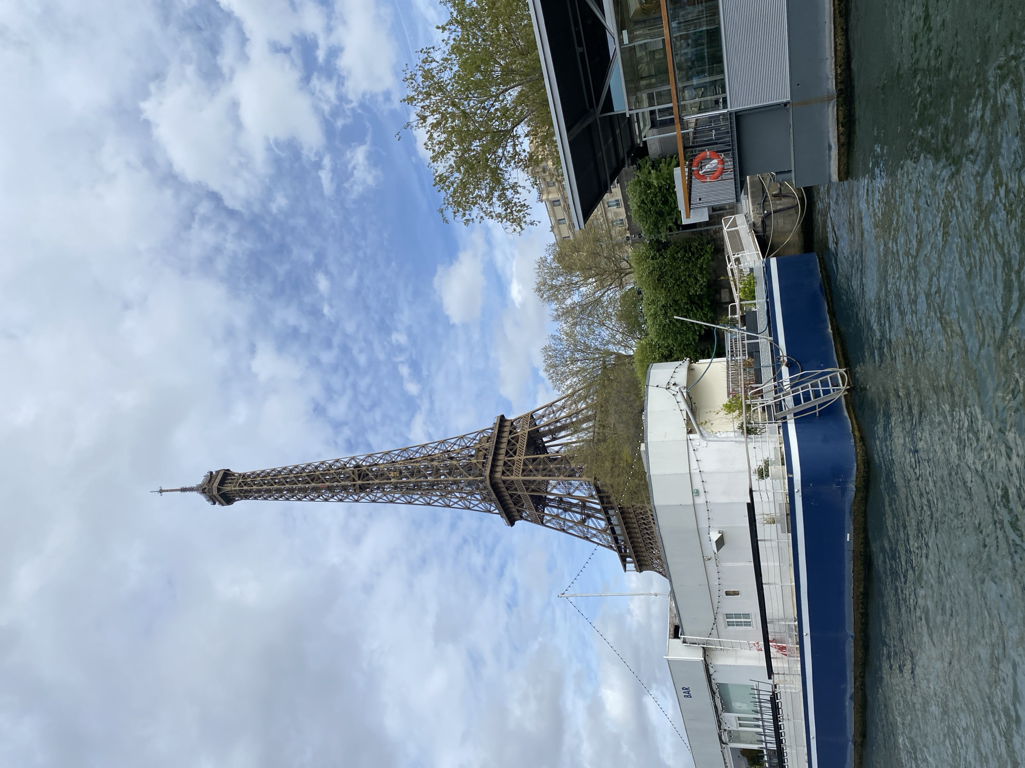 Eiffel Tower in Paris, France, seen from near the Seine River. A docked riverboat with a white and blue hull is partially visible on the right side of the image. Above the riverboat, there is a building with a visible life preserver. The sky is partially cloudy.