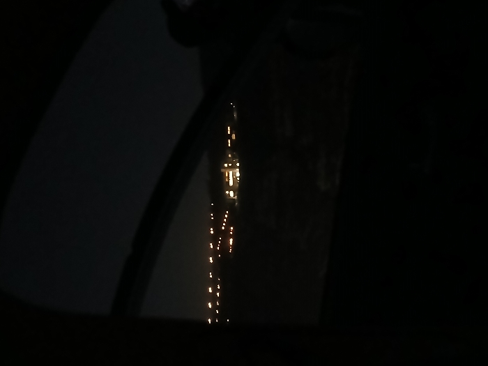 The image displays a nocturnal scene within Dummar Municipality, Syria, captured from the interior of a vehicle looking out a window. The immediate foreground is dominated by dark, indistinct elements of the vehicle's interior, including a prominent curved frame, likely a windshield pillar or dashboard component, extending from the left margin towards the upper right. The distant environment features an urban or suburban landscape illuminated by artificial lights against a dark, featureless night sky. A central cluster of brighter, rectangular lights identifies a larger building or complex in the mid-ground. To the left of this, numerous smaller, diffuse, warm-toned lights are horizontally distributed, consistent with streetlights or lights from other distant structures. No individuals, specific actions, or interactions are discernible within the frame.
