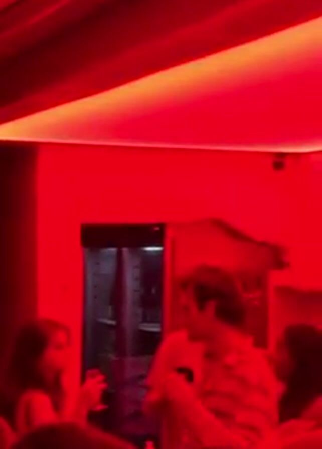 dark room illuminated primarily by red light, with some yellow light near the ceiling. There are blurry figures of people, suggesting movement or a crowded environment. The scene appears to be indoors, possibly a bar or club, given the lighting and the presence of people. There is a dark doorway visible in the background. The camera is unstable.