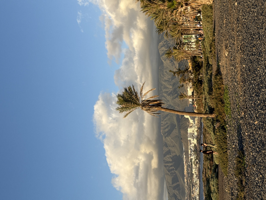 The image displays a serene outdoor scene. A lone palm tree stands prominently against a backdrop of puffy white clouds and a clear blue sky. A majestic mountain range looms in the background, partially obscured by the clouds. Below the mountains, a coastline with buildings is visible. The foreground features a path or area covered in small dark stones, with patches of greenery and additional palm trees lining the edge. Two figures are seen walking along the path.