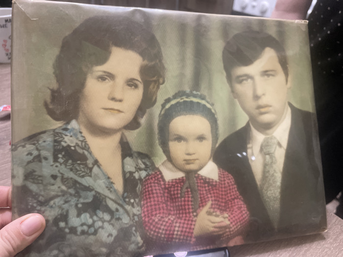 A vintage photograph depicts a family of three. A woman with dark, curly hair wears a floral blouse. A man in a suit and tie stands beside her, his expression serious. A young child in a patterned hat and jacket is positioned in the foreground between them. The photo has a slightly faded, aged appearance and is enclosed in a protective covering.