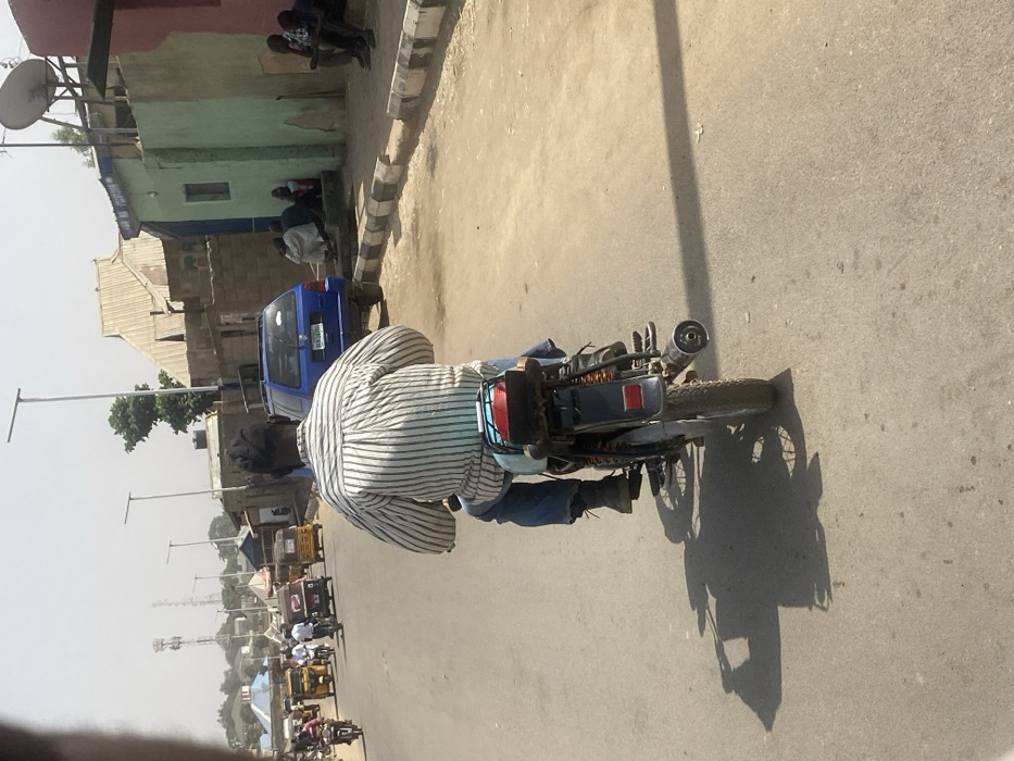 An overhead shot captures a street scene in Tukur Tukur, Nigeria, under bright daylight. In the foreground, a person is seen from behind, riding a dark-colored motorcycle on a paved road. The rider wears a vertically striped light-colored long-sleeved shirt, blue jeans, and dark boots. Their hair appears to be styled in cornrows. The motorcycle has a visible exhaust pipe on the right side and a blue/light-colored rear fender. A dark shadow of the motorcycle and rider is cast on the asphalt directly to the left. The paved road extends into the distance, with multiple vehicles present. In the mid-ground, heading away from the viewer, are several yellow auto-rickshaws (Keke Napep) and other motorcycles. On the right side of the road, a raised curb separates the pavement from a dirt shoulder. A blue SUV is parked on this dirt area. Beyond the SUV, several individuals are visible: a group of three men are seated on a raised concrete step or platform next to a pale green building, and two other men are seated further to the right. The buildings along this side of the street are constructed from concrete blocks, exhibiting varying states of finish and color, including green, red, and unpainted sections. A building with a corrugated metal roof is visible behind the immediate structures, along with a satellite dish mounted on a pole. On the left side of the road, the background reveals more urban development, including additional buildings, utility poles with power lines, and multiple distant telecommunication towers. The sky is clear but appears hazy towards the horizon.
