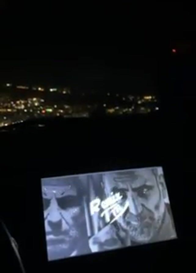 From an elevated vantage point at night, the city lights of a sprawling urban area twinkle in the distance. A screen in the foreground displays a black and white image of two men’s faces, with the words "Remix TV" overlaid. A hand reaches into the frame, sparking a lighter, before withdrawing. The focus shifts between the screen and the cityscape, capturing the contrast between the glowing screen and the illuminated urban landscape.