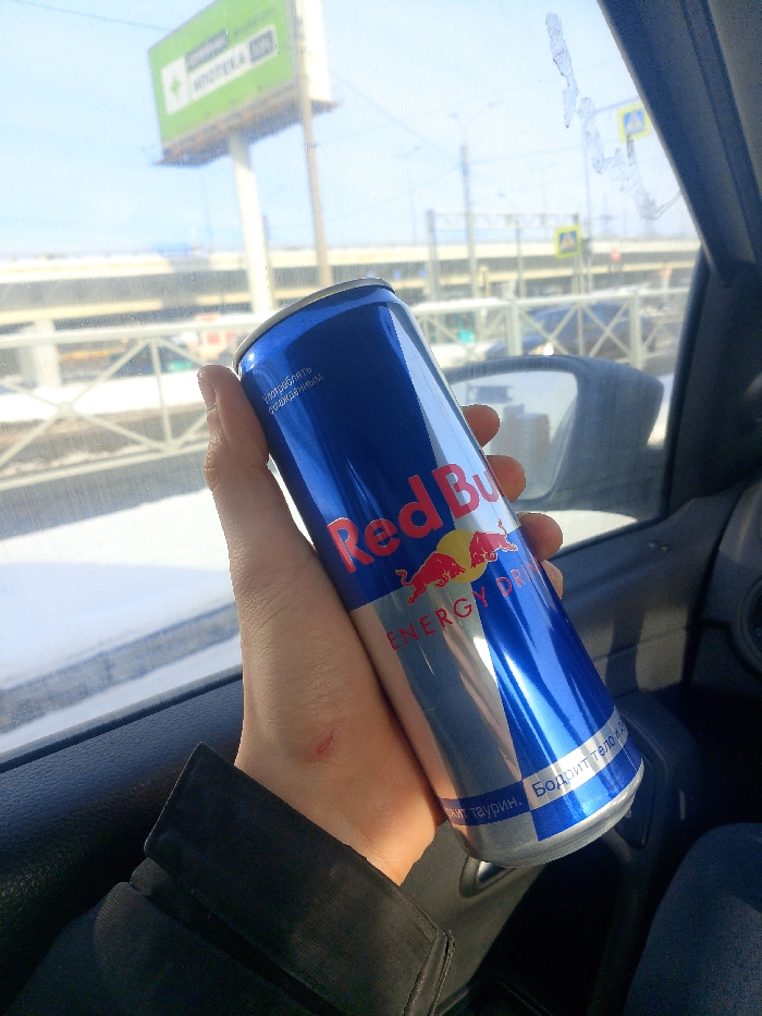 - "A left hand, possibly male, with a visible small reddish mark on the back near the wrist, holds a blue and silver Red Bull Energy Drink can" by FM-mibk92, licensed under CC BY 4.0