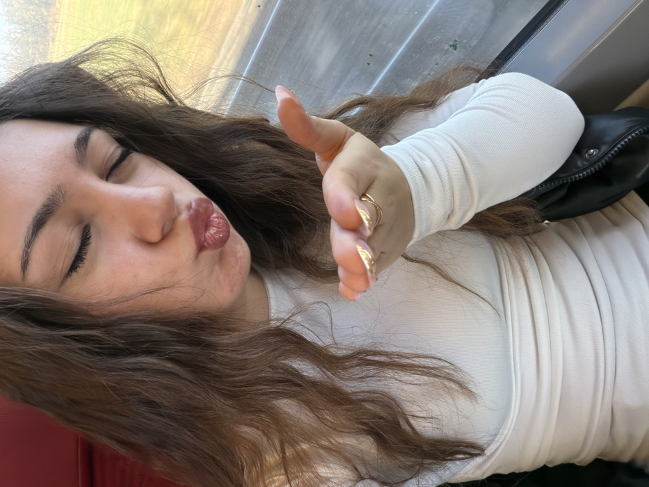 A female individual is depicted within the interior of a moving vehicle, specified as being in Brumath, France. She possesses long, wavy brown hair and is dressed in a form-fitting, high-necked, long-sleeved white or off-white top. Her eyes are closed, and her lips are pursed in a pouting gesture, enhanced by glossy reddish-pink lipstick. Her left hand is extended forward, slightly cupped, revealing manicured fingernails with prominent gold-colored tips and a single gold-toned ring on her ring finger. A segment of a red seat is visible to the left of the subject. To her right, a window displays a blurred outdoor landscape characterized by green fields and brown elements, indicative of motion. A dark, possibly black, garment or accessory is partially visible on her lower right.