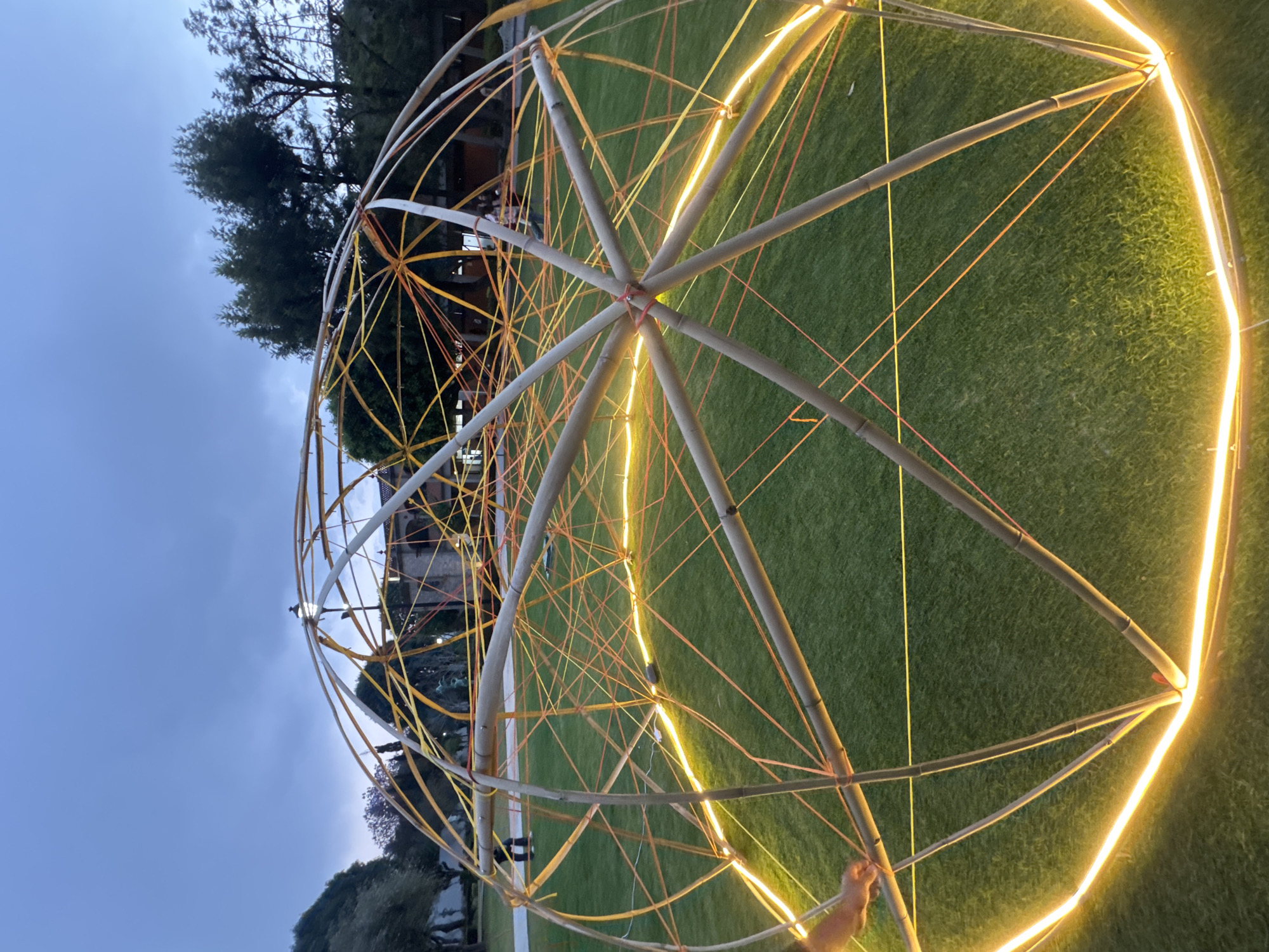 The scene depicts an outdoor public space at dusk in San Andrés Cholula, Mexico. A large, incomplete geodesic dome-like structure, approximately 3-4 meters in diameter, dominates the foreground. It is constructed from interconnected light-colored bamboo or wooden poles, with some junctions secured by red ties. A complex internal network of thinner orange and yellow strings or ropes is interwoven within the pole framework. A continuous bright yellow LED strip light illuminates the entire base circumference of the structure, casting a glow onto the vibrant green grass beneath. A human hand, with light skin, is visible in the lower-left foreground, interacting with the illuminated base. In the mid-ground, blurred human figures are discernible walking or standing near the structure. The background includes dense green foliage from mature trees, a traditional black street lamp, and the partial view of a building. The sky overhead is overcast and blue-grey, consistent with twilight conditions.