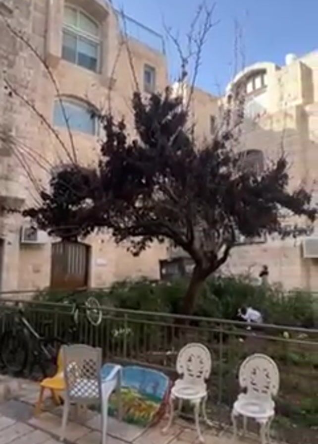 sunny, outdoor scene in what appears to be a courtyard or square in front of an old, multi-story building. The building is constructed of light-colored stone, and has multiple windows and balconies. In the foreground, there are several chairs, including two white ornate ones and one yellow plastic one. A small table with a painting leans against one of the chairs. A few bicycles are visible, leaning against the edge of a raised garden area that is separated from the paved area by a dark metal fence. Within the garden area are several trees, some of which are bare or have few leaves. In the background, a person is visible within the garden area, appearing to be picking something up. The camera slowly pans right to capture more of the building and courtyard.