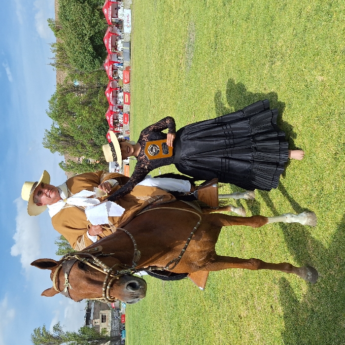 A man in a beige poncho and hat sits atop a brown horse. He holds a document in his left hand and smiles. A woman in a black lace top and long black skirt stands alongside the horse, holding a wooden plaque. Both are wearing straw hats. The background features a grassy field, buildings, and several red tents. The sky is blue with some clouds.