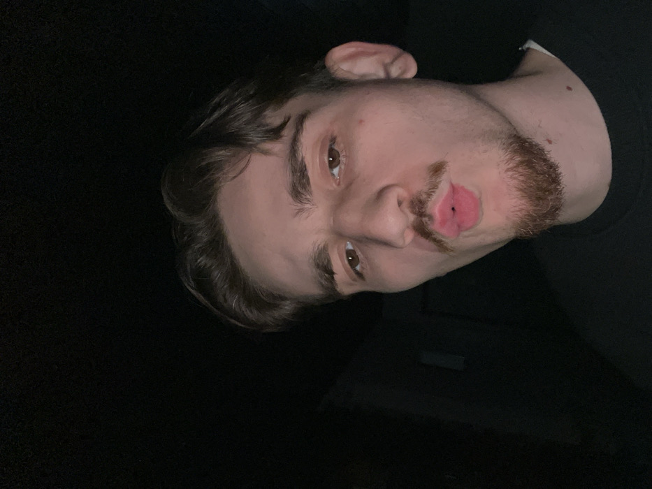 A selfie of a man's face against a dark background, rotated counterclockwise