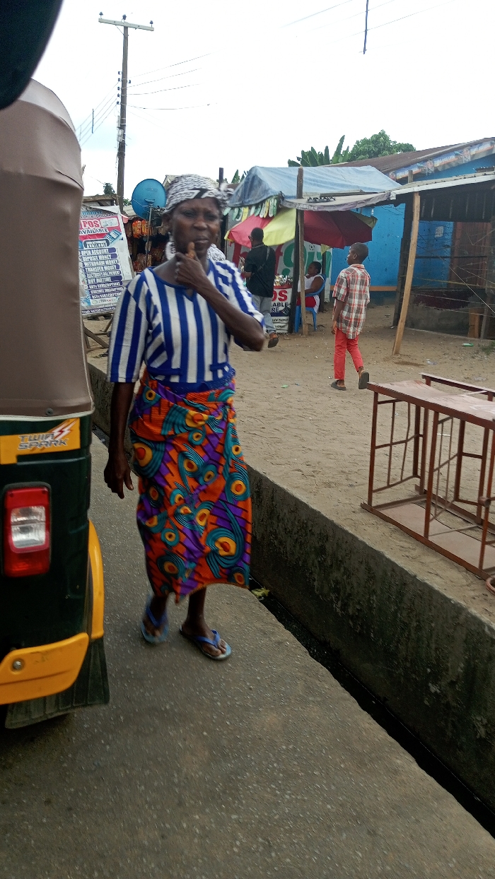 A woman in a blue and white striped shirt and a colorful patterned wrap is walking on a street. She has a headscarf on and is giving a thumbs up. Next to her is a three-wheeled vehicle, partially visible. In the background, there's a man in a red shirt and a small makeshift shop with people gathered around. A utility pole stands tall against the cloudy sky. The environment appears to be a somewhat rural or suburban area with modest buildings.