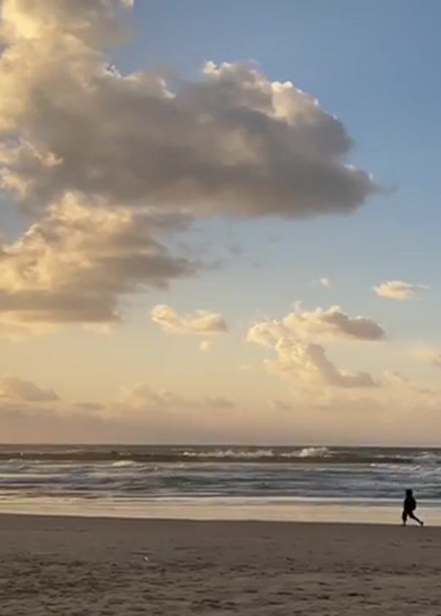 A silhouetted figure walks along a sandy beach towards the right of the frame