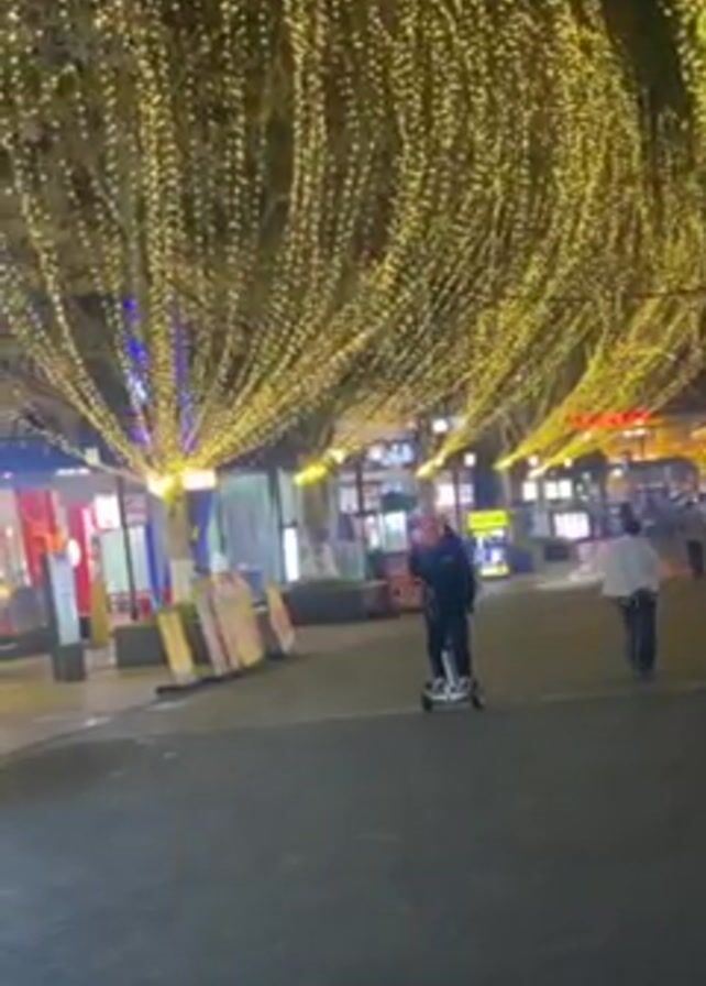 night scene of a pedestrian walkway adorned with strings of yellow lights that resemble the hanging limbs of trees. Several people are walking along the walkway, and one person is riding a personal transporter. There are buildings and signs visible in the background, suggesting a commercial area. The ground appears to be paved and the lighting is generally bright due to the decorative lights and storefronts.