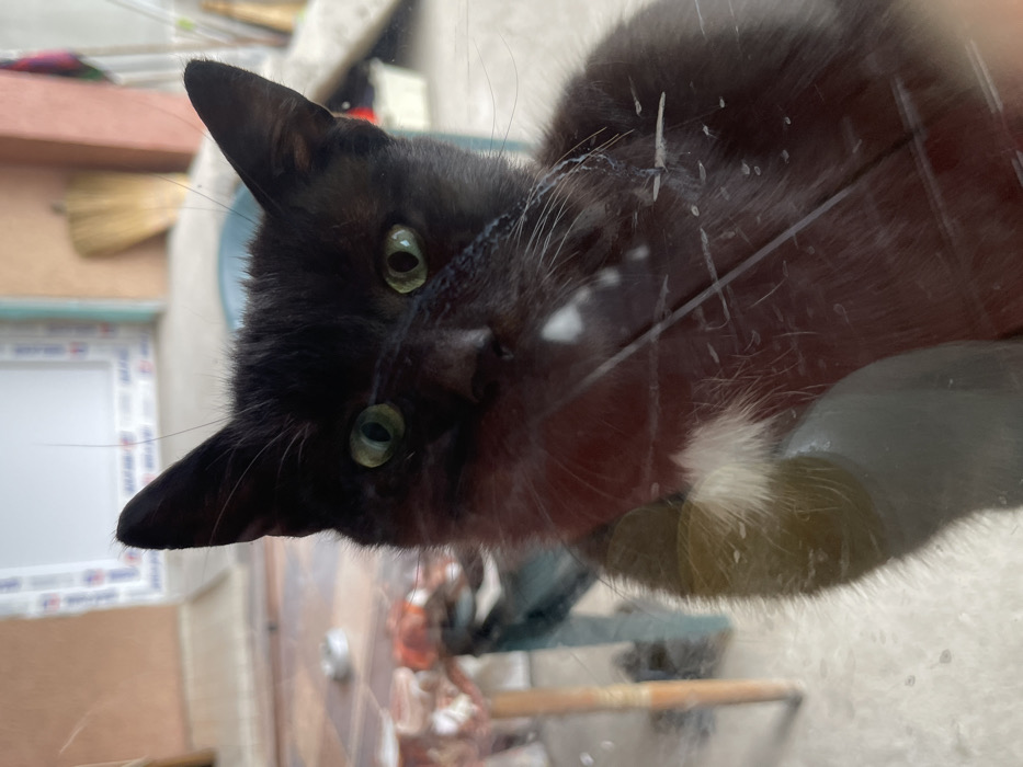 - "An image captured in Kameno, Bulgaria, depicts a black cat with prominent green eyes, observed through a transparent, scratched, and smudged barrier, likely a window or door glass" by FM-pEcJ83, licensed under CC BY 4.0
