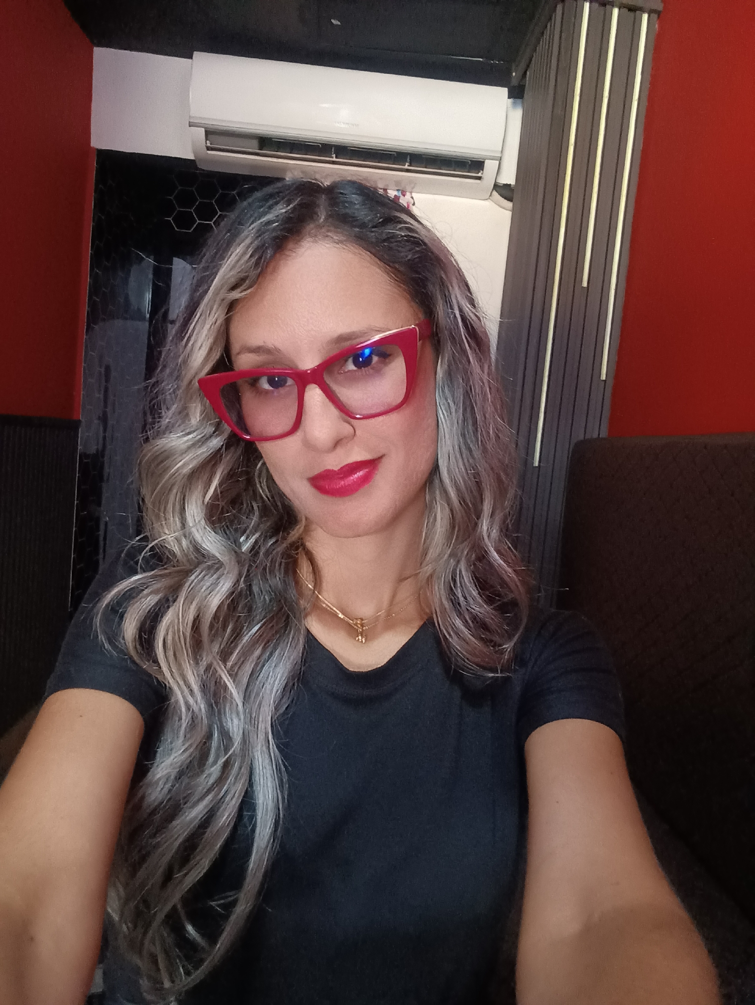 The scene is situated indoors in La Victoria, Venezuela. A single adult female is centrally depicted in a chest-up selfie, facing the camera directly. She possesses wavy, multi-toned hair featuring gray and blonde highlights, and is dressed in a black short-sleeved t-shirt. A gold-colored necklace with a small pendant rests on her chest. Her face is characterized by red cat-eye glasses, exhibiting blue anti-reflective lens reflections, and bright red lipstick, accompanied by a subtle smile. The background is divided by distinct wall treatments. A vibrant red wall is visible on both the left and right sides of the frame. To the upper left, a white split-type air conditioning unit is mounted high on the wall, partially above a section of dark hexagonal-patterned wall covering. To the right of the subject, a vertical dark paneling with thin, light-colored vertical accents is present, adjacent to a dark, upholstered seating unit.