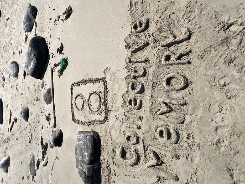 The image displays a sandy beach in Vĩnh Lương, Vietnam, under direct sunlight. In the foreground and mid-ground, the words "Collective Memory" are deeply carved into the sand. Above this text, a rectangular shape is drawn in the sand, containing two stacked circular outlines, resembling a stylized speaker or an audio equalizer icon. Scattered across the sand, primarily in the upper half of the frame, are numerous dark grey, smoothed rocks of varying sizes. A piece of driftwood lies horizontally on the sand to the right of the rocks. A small piece of green, possibly synthetic, netting or mesh is visible on the sand near the driftwood, alongside dark organic debris such as seaweed. No individuals are present in the scene.