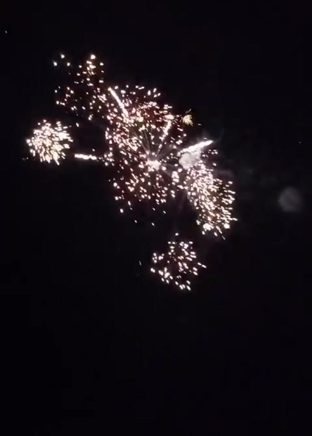 fireworks exploding in the night sky. The first firework has a bright white flash, followed by a wider bloom with a lens flare effect. Subsequently, several fireworks explode, creating bursts of light and sparks in the dark sky. The explosions vary, with some producing dense clusters of light and others trailing sparks. Sounds of the explosions are also audible.