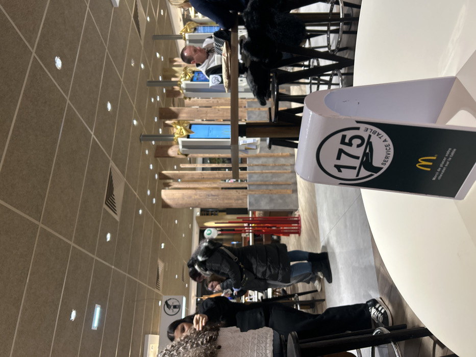 McDonald's restaurant interior. A white table marker with the number "175" and the phrase "SERVICE A TABLE" is prominently displayed. The McDonald's logo is also visible, along with the phrase "Merci de placer votre chevalet sur la table." Several people are seated at tables in the background. The overall impression is of a brightly lit and moderately busy fast-food establishment. The image appears to be taken from a slightly angled perspective.