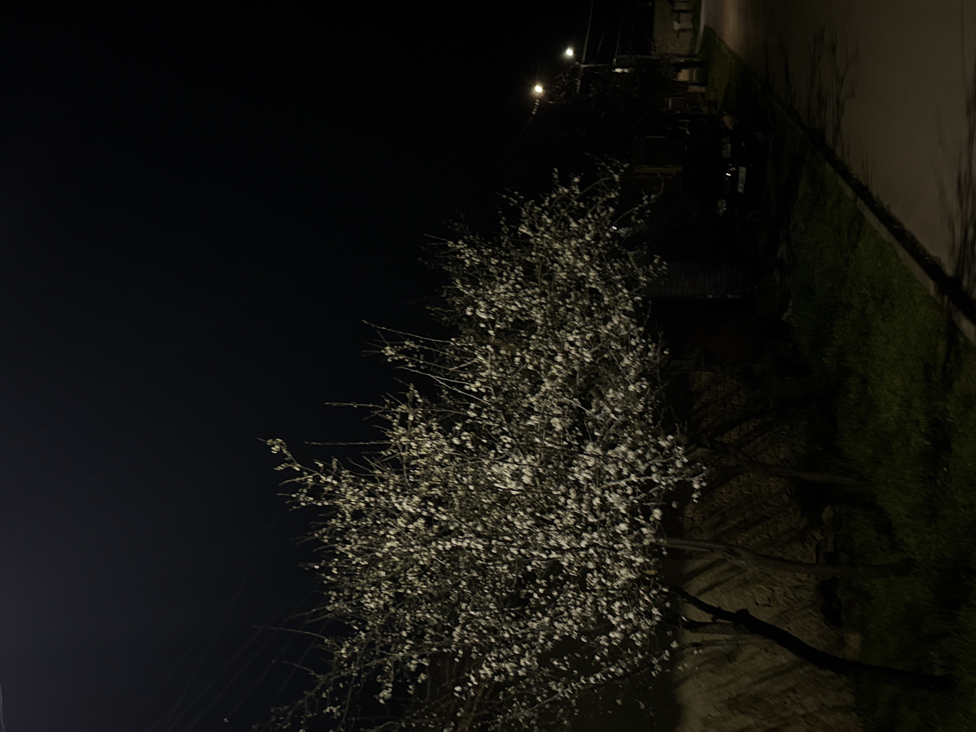 - "At night in Smyadovo, Bulgaria, a tree with white blossoms stands next to a sidewalk" by FM-lW72m1, licensed under CC BY 4.0