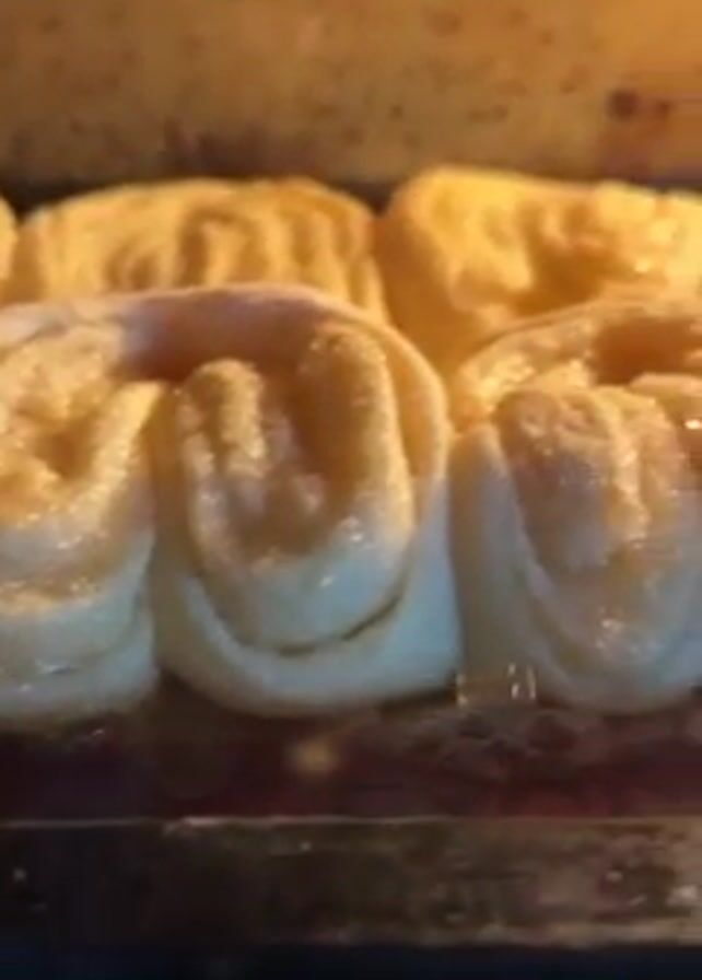 row of pastry rolls baking in an oven. The rolls are a light golden color and have a swirled shape. The camera then pans down to show a small, brown poodle puppy lying on a white, fluffy bed. The floor is white tile. A dark metal rack and a grey pet bed are also visible.