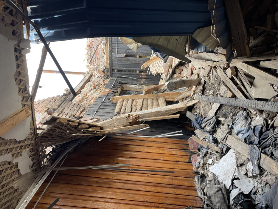 interior of a damaged building in Verkhnya Syrovatka, Ukraine