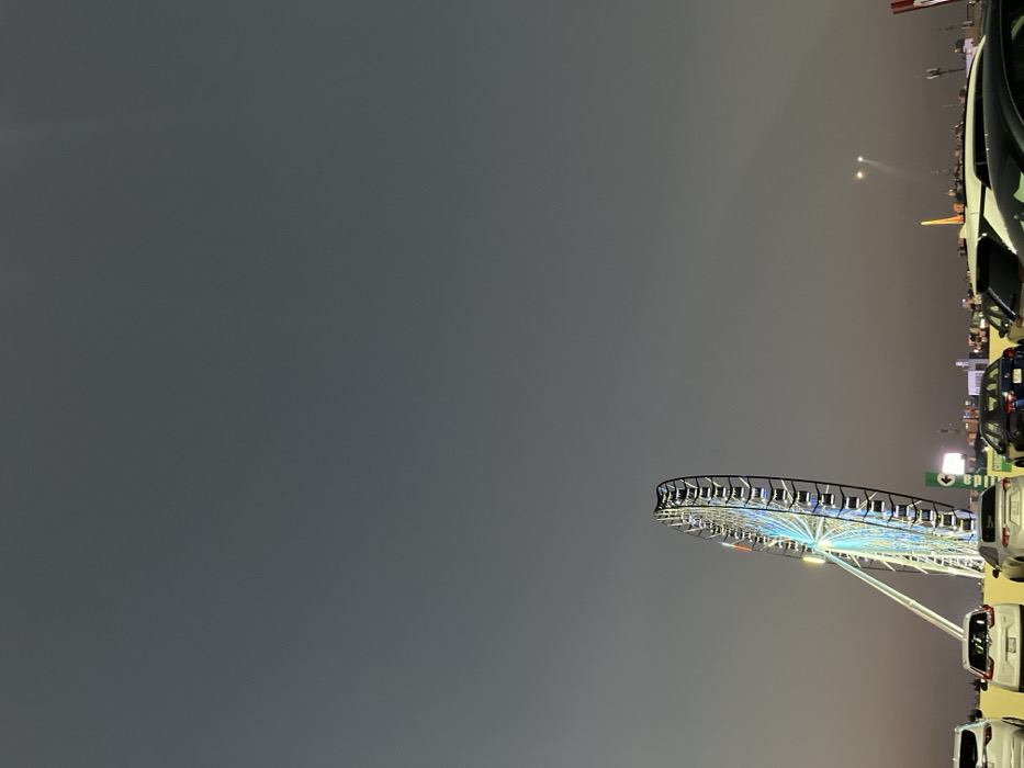 At night, a Ferris wheel illuminates the scene with blue and white lights. It stands against a grey sky. Cars are parked closely to the right of the Ferris wheel. Distant city lights are barely visible in the upper-right. Two bright lights are near the top, potentially aircraft.