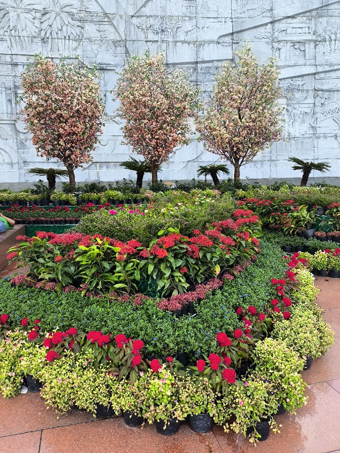 The scene depicts an outdoor floral display or garden arrangement located in Quy Nhon Ward, Vietnam. The foreground features a reddish-brown tiled ground, possibly wet. Multiple black plastic pots containing light green foliage plants and plants with spherical bright red flowers are arranged along the curved edge of a larger flowerbed. This flowerbed contains an inner ring of dark green shrubs with clusters of red flowers (Ixora), a middle layer of dense green foliage, and an outer border of smaller reddish-pink flowering plants. Behind this main flowerbed, additional potted plants in black containers are visible, forming further tiers of green and red foliage. To the far left, a person's leg, clad in a green garment, rests on a low planter. In the midground, three prominent trees with full canopies of artificial-appearing light pink and white blossoms stand tall. Beneath and between these trees, several shorter, palm-like plants with dark trunks are positioned. The background is dominated by a large, light-grey textured wall featuring extensive relief sculptures. These sculptures depict architectural structures, natural elements, and various intricate patterns. The lighting is diffused, indicating an overcast sky or indirect sunlight.