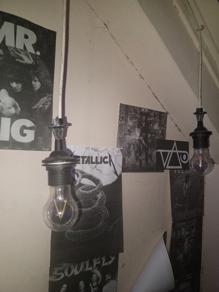 A room corner features numerous band posters, including ones for Metallica, Steve Vai, and Soulfly. Two unshaded hanging light bulbs illuminate the space. The walls are a muted cream color and converge at an angle near the ceiling. The posters are haphazardly affixed to the wall, creating a cluttered and expressive rock-inspired aesthetic. The lighting fixtures are simple in design, adding a minimalist contrast to the surrounding chaos of the band posters.