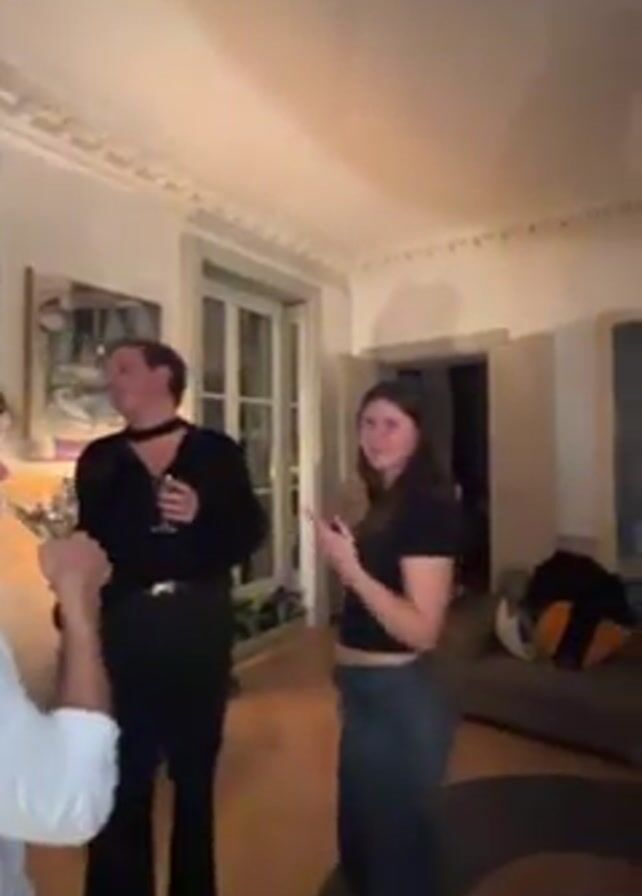 A small gathering appears to be taking place indoors, in a well-lit room. Several individuals are present, engaged in conversation. A man in a white shirt stands to the left, holding a glass. A woman in black stands nearby, also holding a glass. A second woman is standing to the right, clad in a black shirt and jeans. The room features a chandelier, a large painting, a sofa with some belongings on it, and small tables holding bottles and items. The environment suggests a social gathering, possibly a party or a casual get-together.