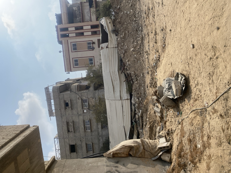 The image portrays a desolate scene, likely after a conflict or disaster. Damaged buildings stand against a hazy sky. A corrugated metal structure lies collapsed in the foreground, amidst rubble and debris. The ground is barren and sandy. Discarded materials are scattered around. There appears to be a cloth or tarp partially covering some debris. A power line is visible in the upper right corner of the image.
