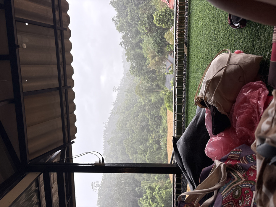 The scene depicts an outdoor landscape viewed from a sheltered structure in Ban Paem Bok, Thailand