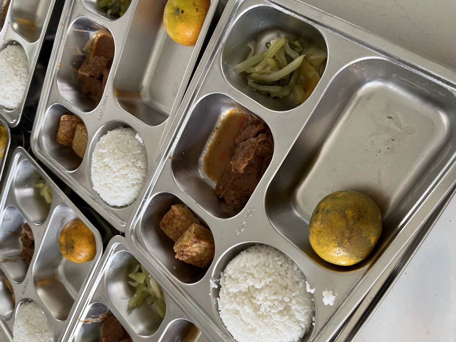Several metal trays containing a meal are seen at an angle. Each tray has distinct compartments. One compartment contains a serving of white rice, another holds what appears to be tempeh, and yet another contains meat in a sauce. A different compartment has a pickled or vegetable dish, while the last holds a whole orange. The meals are likely being served in a cafeteria or institutional setting.