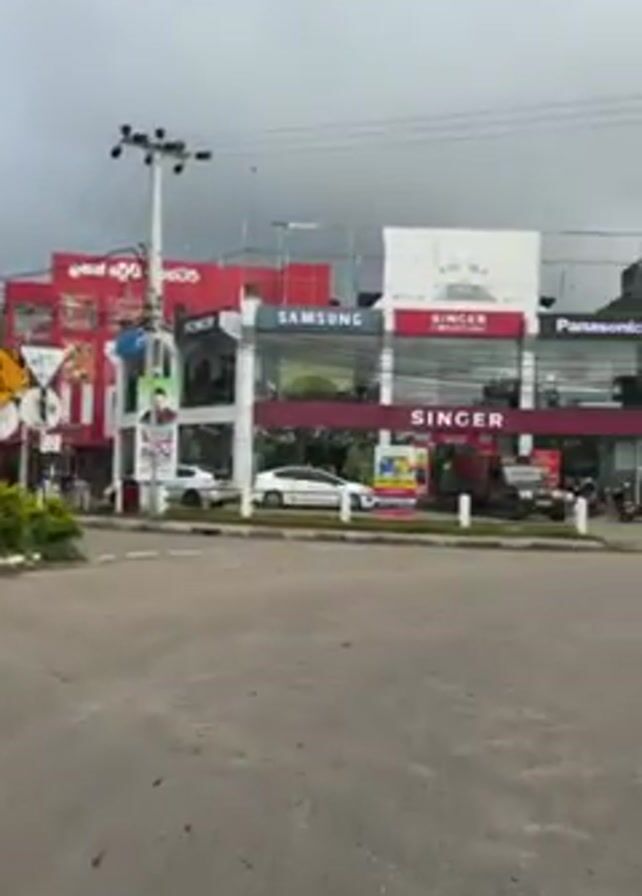 roundabout in a Sri Lankan town. The sky is overcast. Several businesses, including Singer, Samsung, and Panasonic, are visible around the roundabout. There are also traffic signs and some greenery. A few vehicles and people are seen moving in the distance. The road appears to be mostly empty.