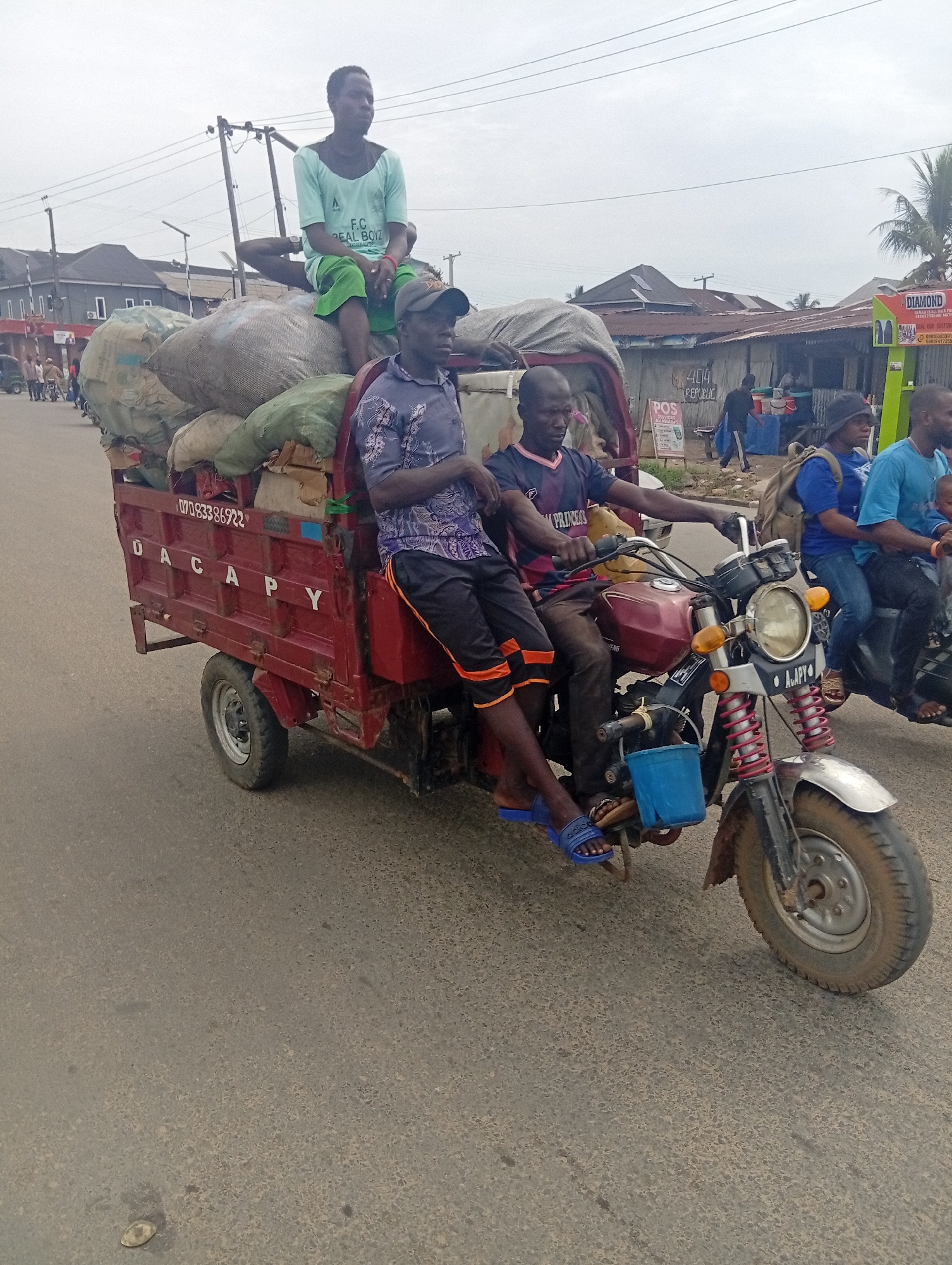 Captured in Aba, Nigeria, the image shows a red three-wheeled motorcycle heavily loaded with multiple sacks. Three individuals are on the vehicle: one atop the sacks, another riding as a passenger, and a third driving. The vehicle's cargo bed is marked with "DACAPY" and a phone number. A small blue bucket is attached to the front of the motorcycle. The street has other vehicles, and there are commercial signs visible in the background. The sky is overcast.