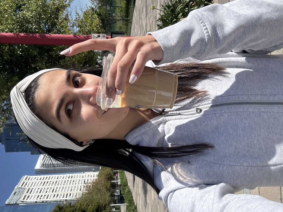 A woman is depicted in a daytime outdoor setting in Mexico City, specifically in a modern urban district characterized by high-rise buildings, such as Santa Fe or Polanco. She is observed from the chest up, centrally framed, holding a clear plastic cup containing a light brown beverage, likely iced coffee, to her mouth with her left hand. Her fingernails are painted with light pink polish, and her left index finger is slightly extended. She wears a white, ribbed headband, pulling back her dark hair, and a light grey full-zip hooded sweatshirt. Her gaze is directed towards the upper right portion of the frame, accompanied by a subtle smile. In the background on the left, multiple contemporary high-rise buildings are visible behind a paved walkway lined with trees. On the right, a prominent red pole stands near green vegetation. The scene is illuminated by bright sunlight, casting visible shadows.