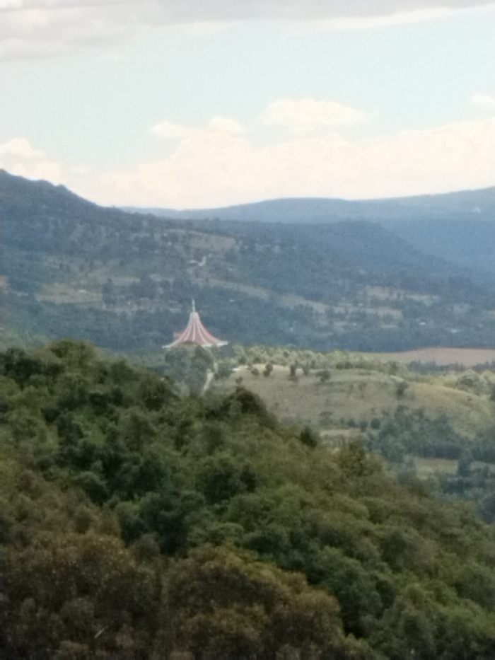 This image presents a wide view of a natural landscape with a prominent structure, located in Waseges ward, Kenya. In the midground, a distinctive building features a multi-tiered, conical roof, patterned with alternating red and white sections, culminating in a slender finial at its apex. This structure is situated on a gentle slope surrounded by green vegetation. The immediate foreground consists of dense, dark green tree canopies, indicating a forested hillside from which the photograph was taken. Beyond the central building, the terrain continues with rolling green hills and valleys, showing varied levels of tree density and patches of lighter, possibly grassy, ground. The distant background reveals multiple layers of blue-tinted mountain ranges receding into the horizon. The sky above is a light blue with scattered white cumulus clouds. No individuals, animals, or explicit actions are visible within the scene.