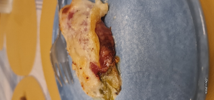 A close-up image features a slice of food, possibly a savory crepe or rolled dish, displayed on a blue plate. The filling includes a dark brown element, potentially sausage or meat, alongside green vegetables. A silver fork rests beside the food on the plate. The background consists of a yellow and blue patterned surface, possibly a tablecloth or placemat.