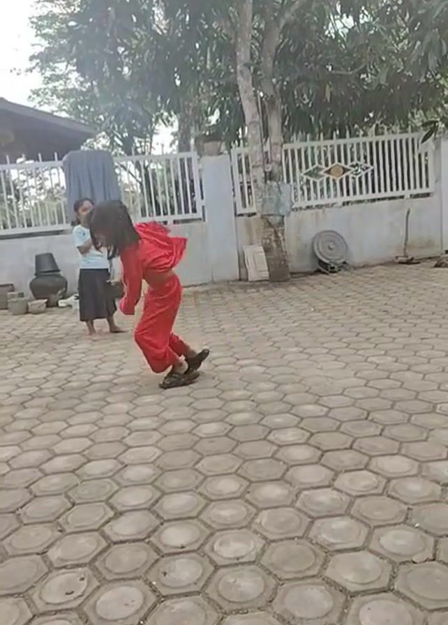 Two young girls are in a paved area in front of a white fence and a house. One girl, wearing a red outfit and sandals, is doing a cartwheel. The other girl, wearing a light blue shirt and a dark skirt, is standing still, smiling and watching. There are some pots and other items near the fence, and a tree in the background.