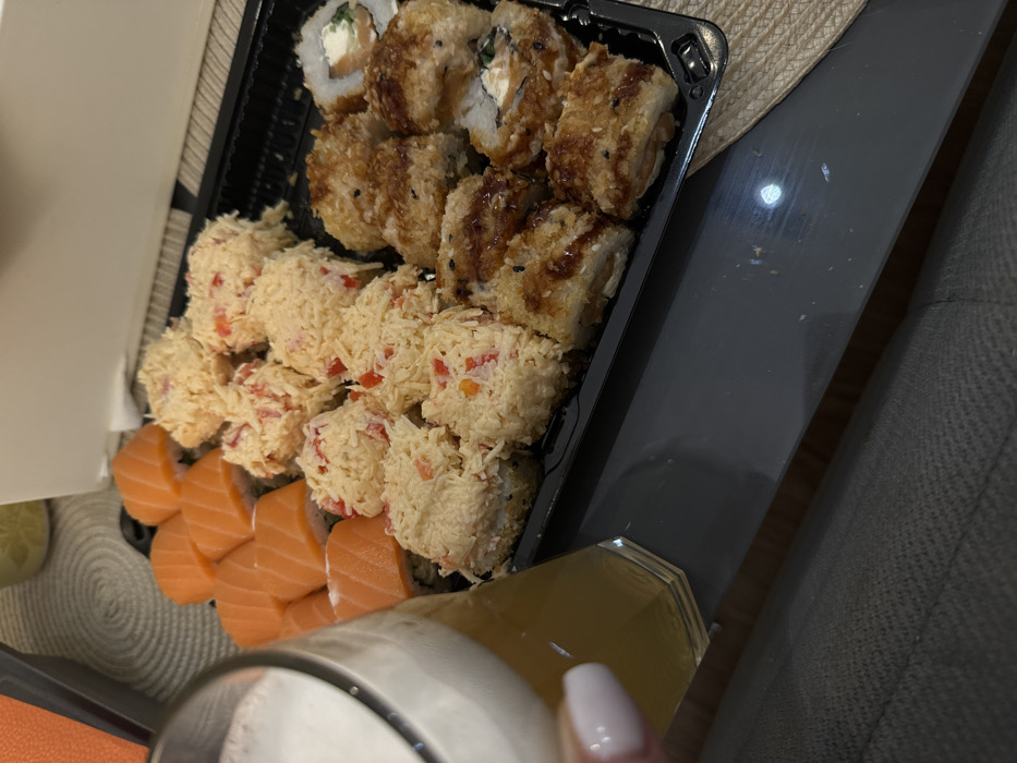 A platter of sushi rests on a table next to a glass of yellow liquid. The sushi variety includes rolls topped with shredded white imitation crab with red peppers, slices of salmon, tempura fried rolls, and classic rolls with cream cheese and salmon. The arrangement is in a black plastic container. A fingernail with white polish is visible near the glass. A portion of a gray couch or chair is adjacent to the platter.
